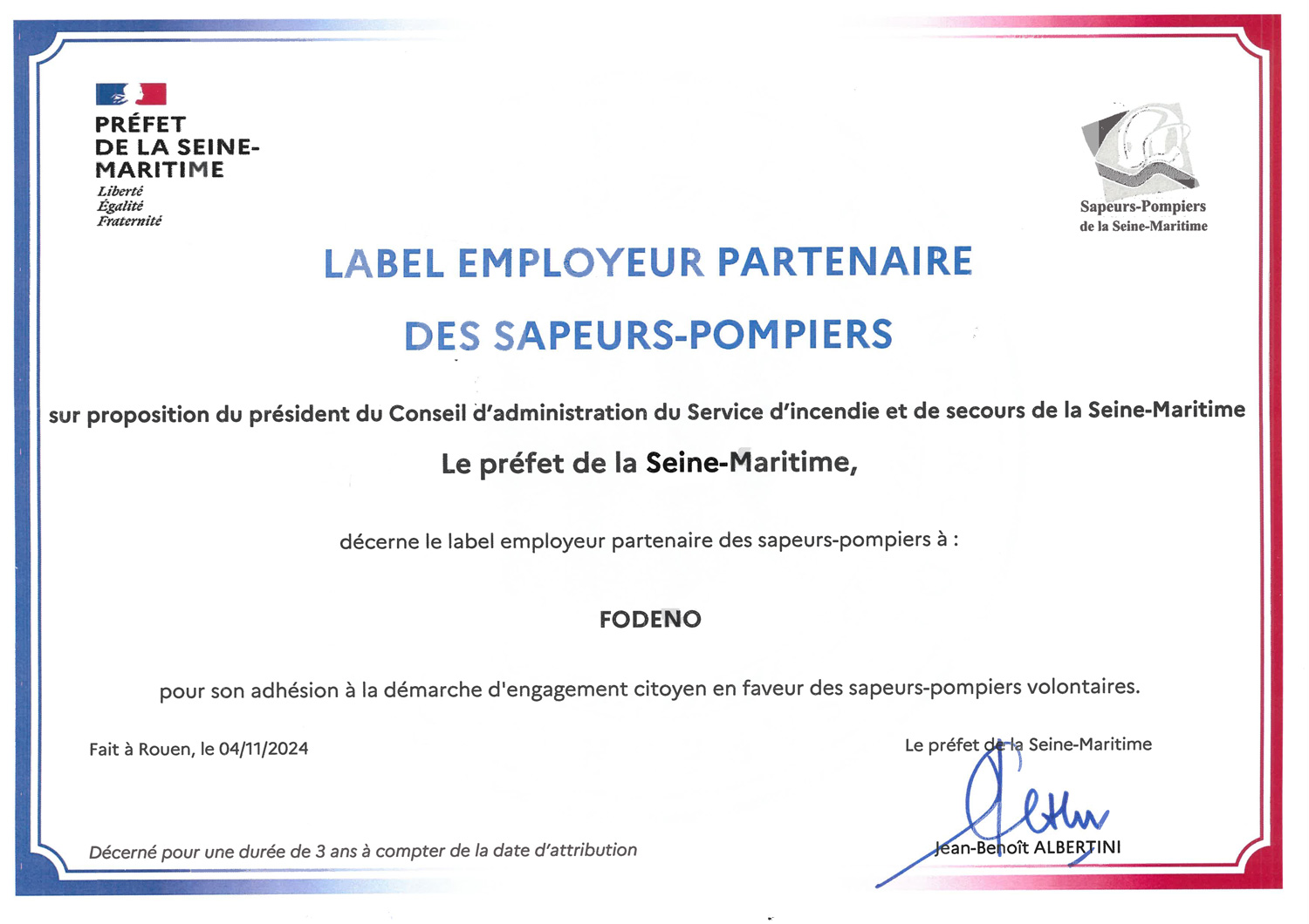 Le 4 novembre dernier, Fodeno a été invité en Préfecture à la cérémonie de remise du label « employeur partenaire des sapeurs -pompiers », en présence de Monsieur Albertini préfet de Région, Mme Hérouin Députée et Monsieur Bellanger, Président du Département